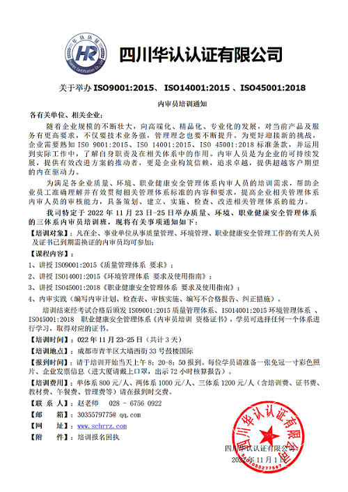我司特定于2022年11月23日-25日举办质量、环境、职业健康安全管理体系的三体系内审员培训班,现将有关事项通知如下: